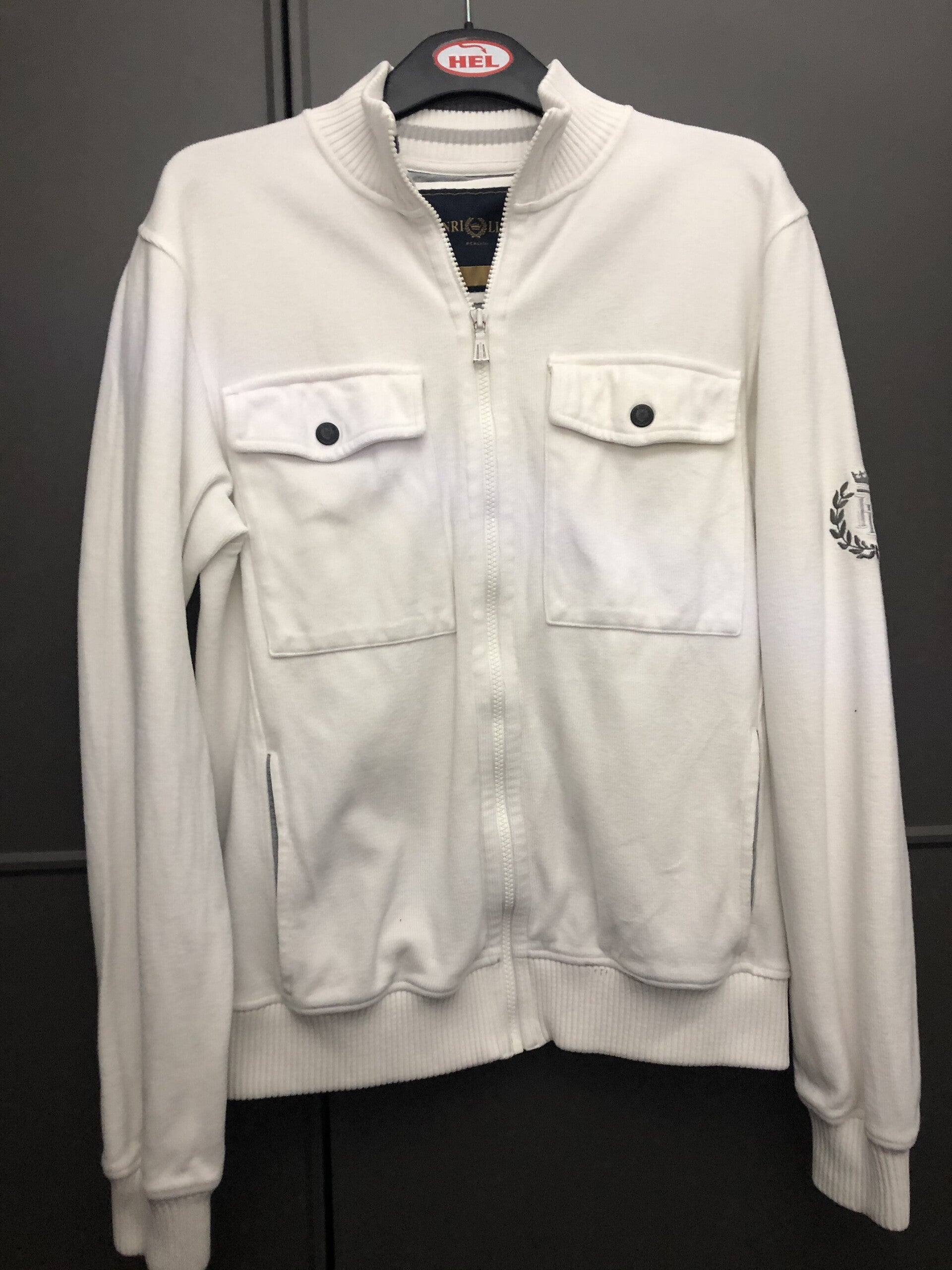 This Henri Lloyd piece has been dragged straight from the 90s with its breast pockets, embroided crest on the sleeve and its velvet like material. for its age it is in amazing condition with the only problem being the zipper has had some paint chipping that can be easily fixed with your younger sibling painting set. it has an elasticated collar bottom and cuffs.